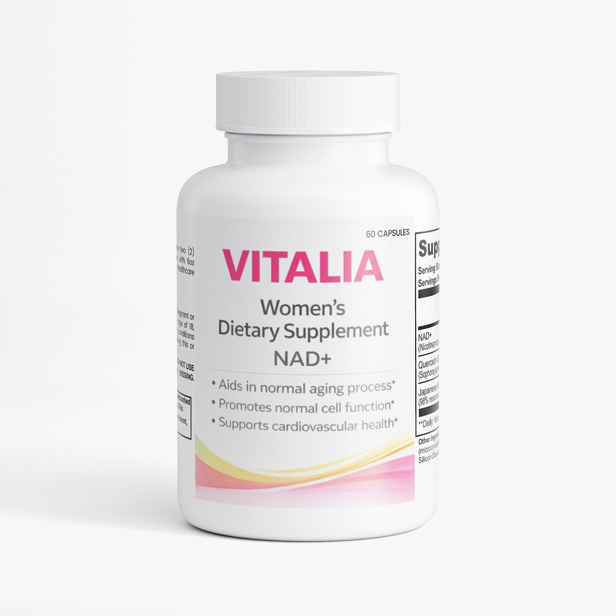 What is the main ingredient in Vitalia's NAD+ Supplement and what does it do?: The Vitalia NAD+ Supplement contains 500 mg of NAD+ (Nicotinamide Adenine Dinucleotide), which is a coenzyme essential for energy production and cellular repair in the body. It is complemented by Quercetin for immune support and Resveratrol for cardiovascular and cognitive health.